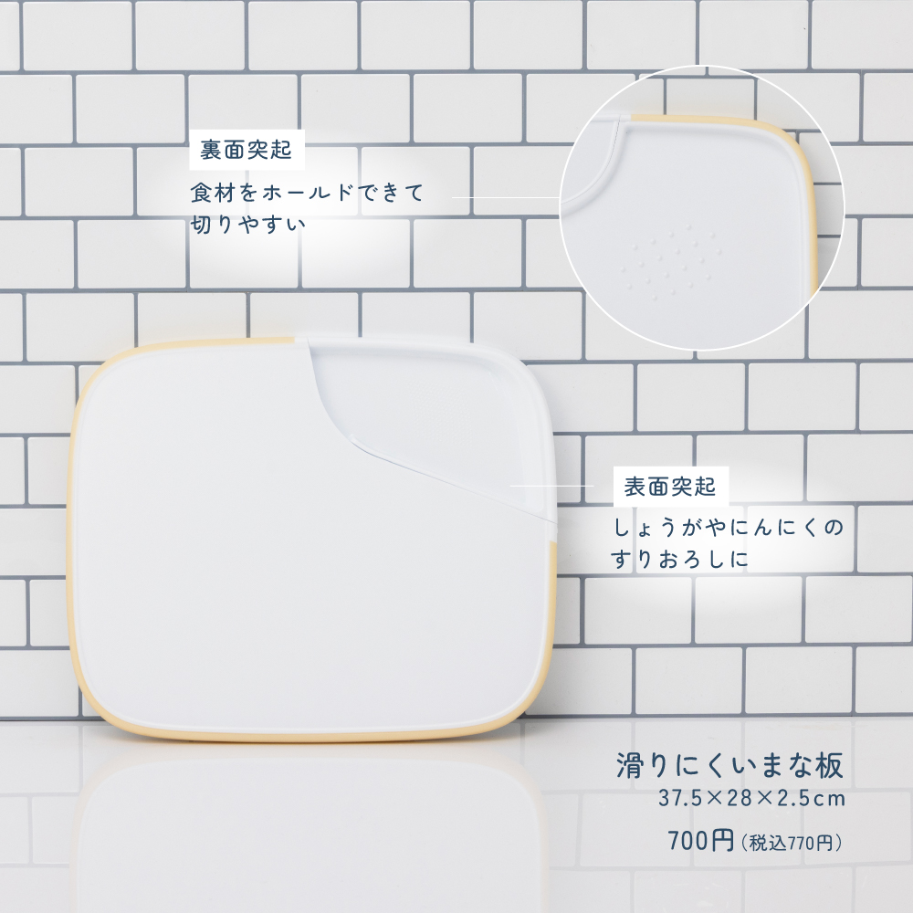 滑りにくいまな板の表面突起はしょうがやにんにくのすりおろしに、裏面突起は食材をホールドできて切りやすい使用に。
