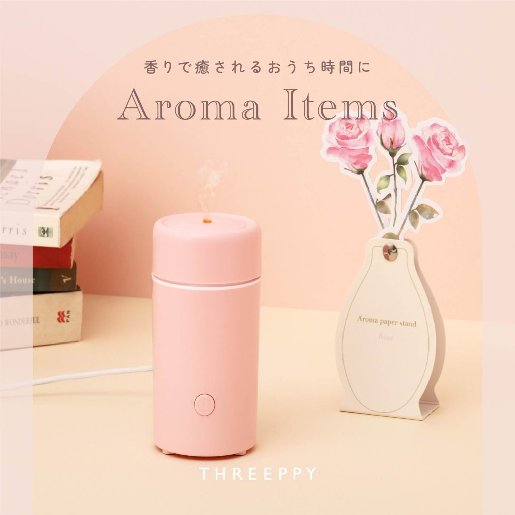 アロマディフューザーはミストと一緒にほんのりあたたかい光が灯って、寝室やデスク周りにもぴったりの落ち着いた雰囲気に。