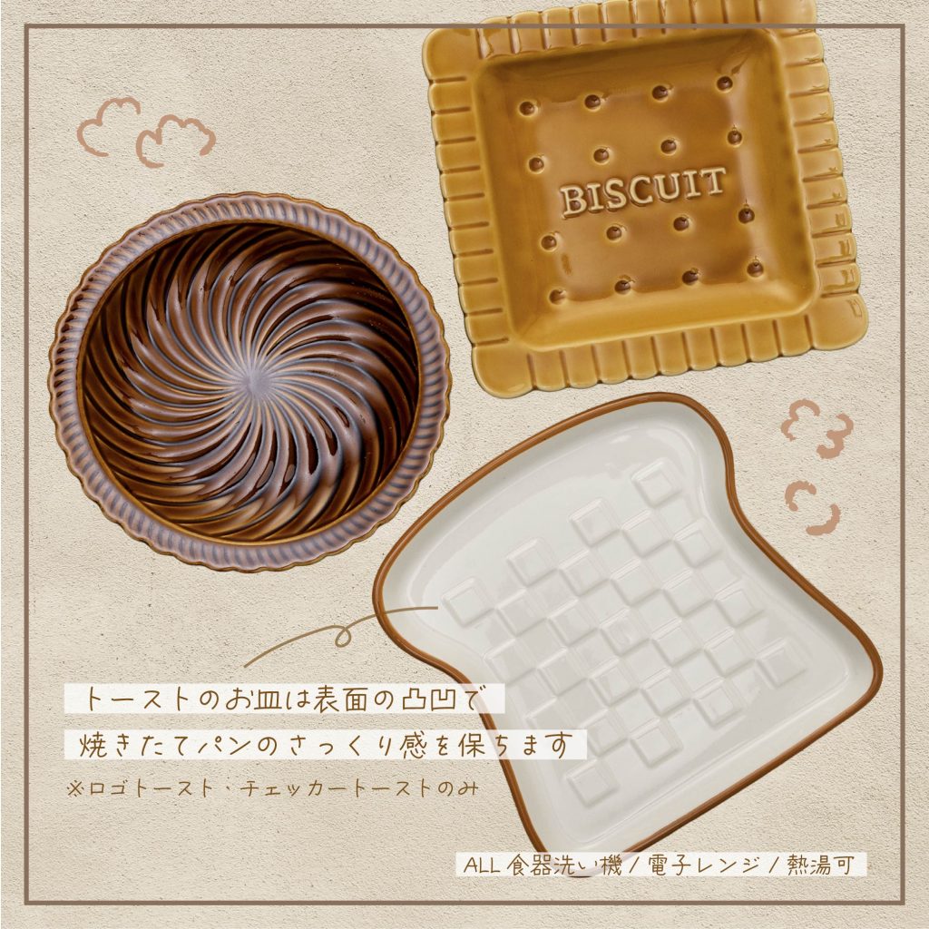 パンや焼き菓子をモチーフにした遊び心のあるデザインでいつものおやつや朝食タイムを、ちょっと特別にしてくれます☕🍪